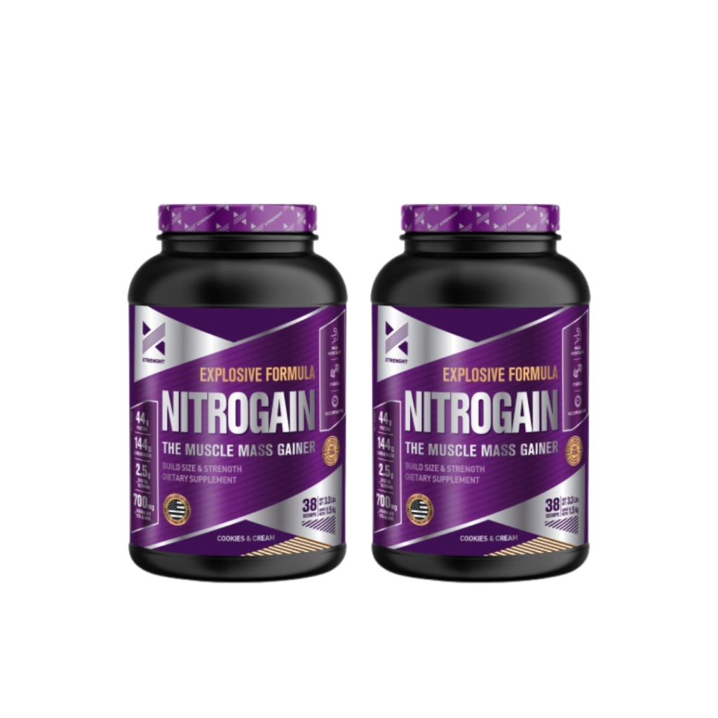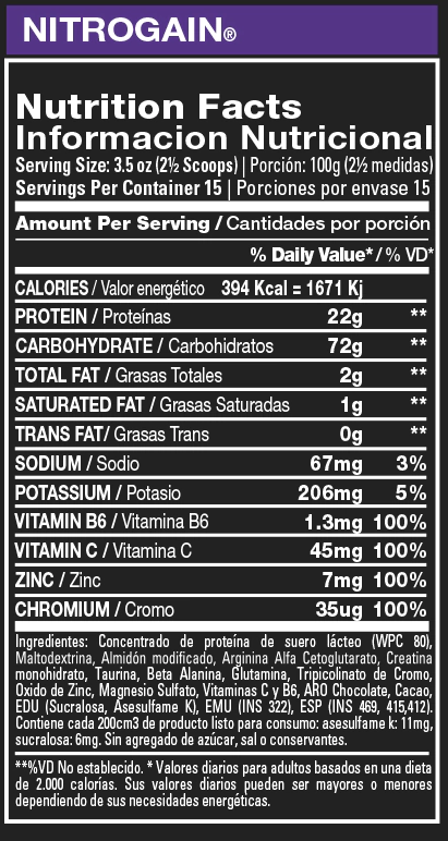 ¡Agrandate con NITROGAIN ®! La solución para aumentar de peso o superarte en competencias de alto rendimiento. Es el ganador de peso más efectivo, ya que en una sola porción combina 70 gramos de proteína pura y del más alto nivel biológico, con 135 gramos de carbohidratos, Beta Alanina, Creatina, Glutamina y Taurina, y además está potenciado con Óxido NÍtrico para que estos nutrientes lleguen más rápido a tus músculos.